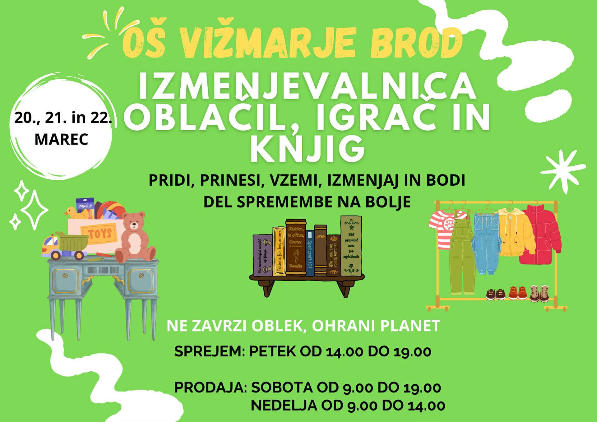 Dragi starši in krajani, vabimo vas na sejem izmenjevalnice oblačil, igrač in knjig. Kolikor kosov prineseš, toliko kosov lahko odneseš ali pa jih kupiš po simbolični ceni. Sejem bo potekal od petka, 20. marca, do nedelje, 22. marca, v avli razredne stopnje naše šole.