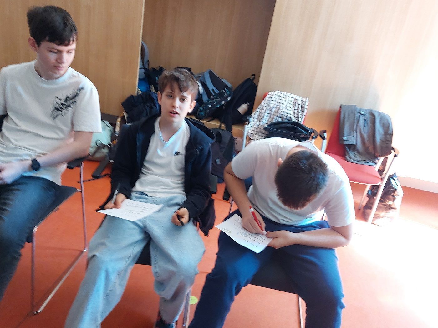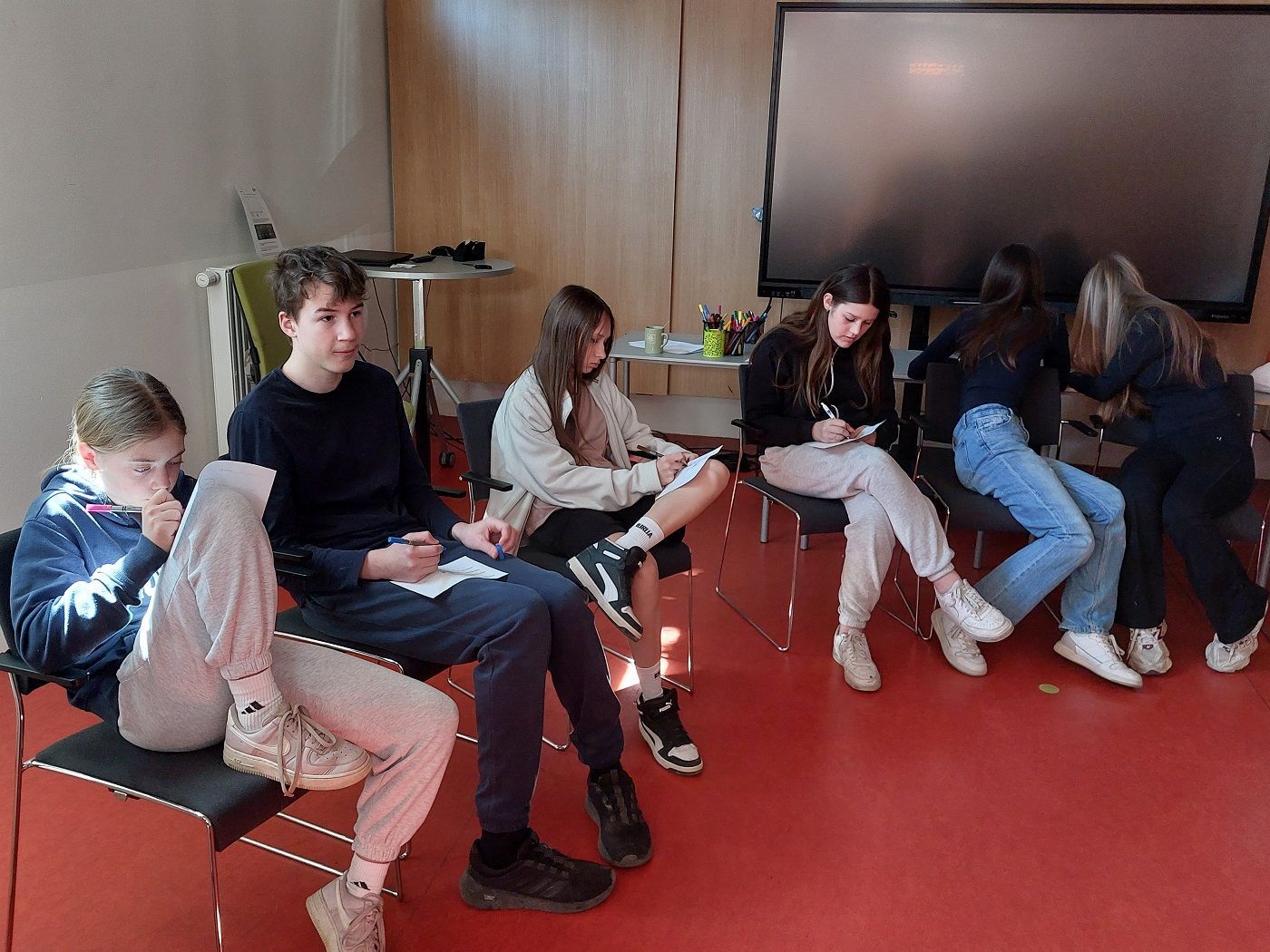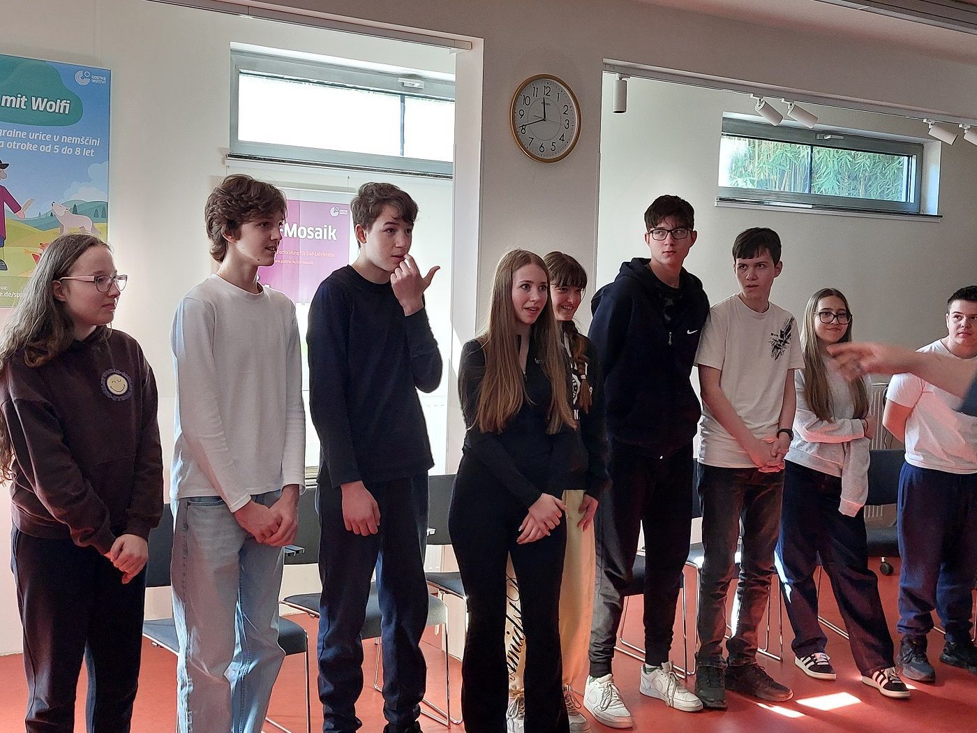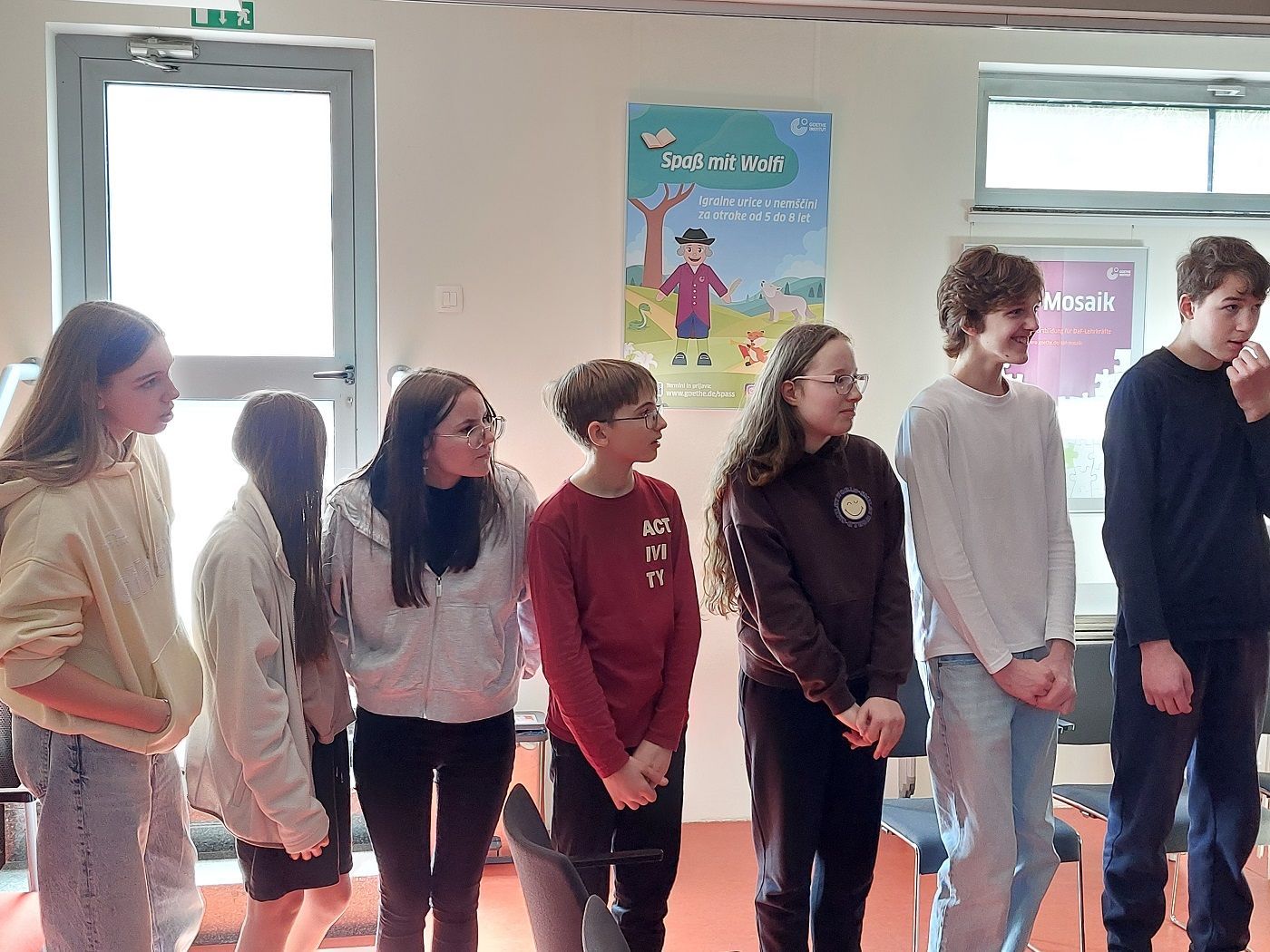 Za učence 8. in 9. razreda iz OŠ Vižmarje Brod in za učence 9. razreda iz OŠ Preserje pri Radomljah, ki obiskujejo obvezni izbirni predmet nemščino, sva učiteljici Nina Čeh (OŠ Vižmarje Brod) in Nataša Žlindra (OŠ Preserje pri Radomljah) v sklopu projekta Schreib mir!/Piši mi! v sredo, 8. 4. 2026 organizirali skupno srečanje v Goethe Institutu.