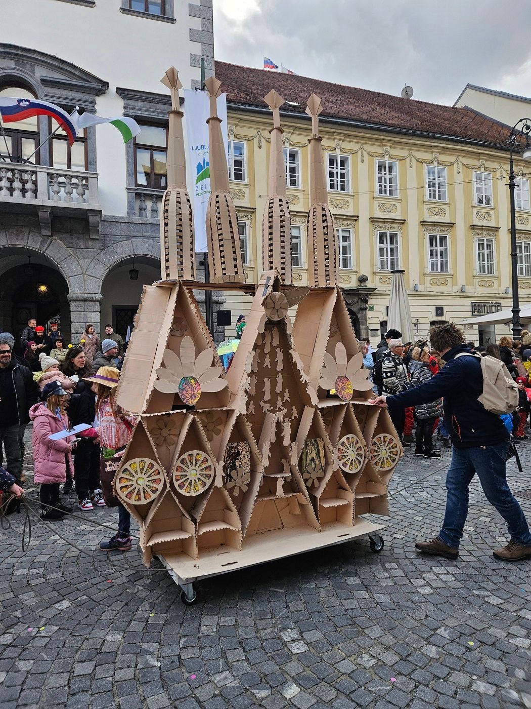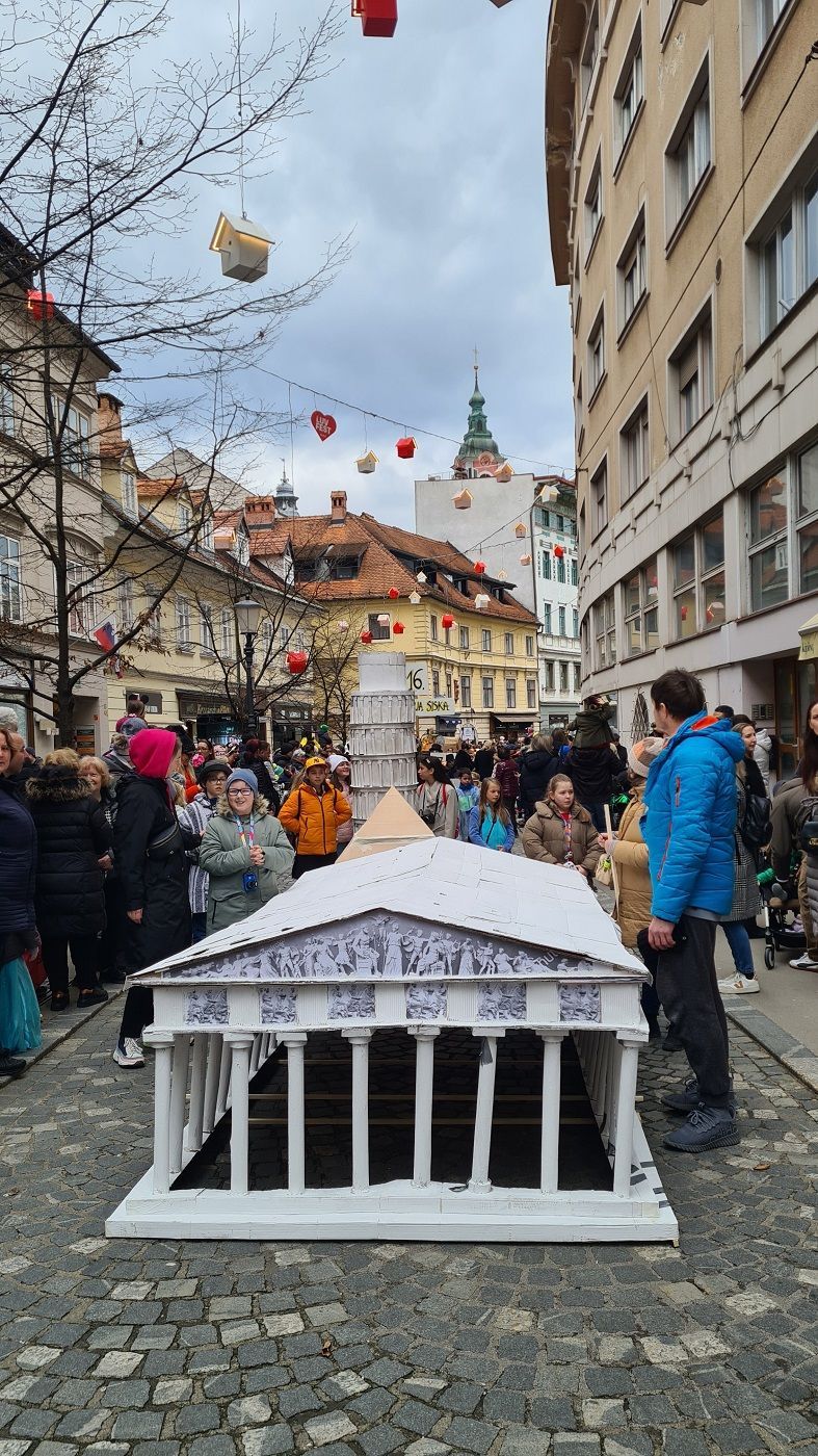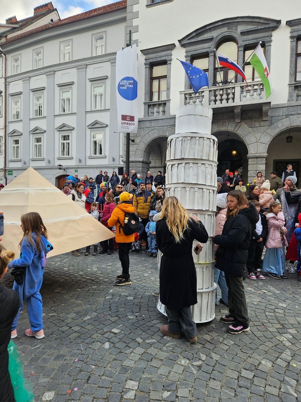 Omamen vonj po francoskih rogljičkih se širi po trgu – neee, to so pustni krofi! Turisti si ogledujejo nekakšen mali stolpek, podoben je Eifflovemu, vendar mora še malo zrasti.