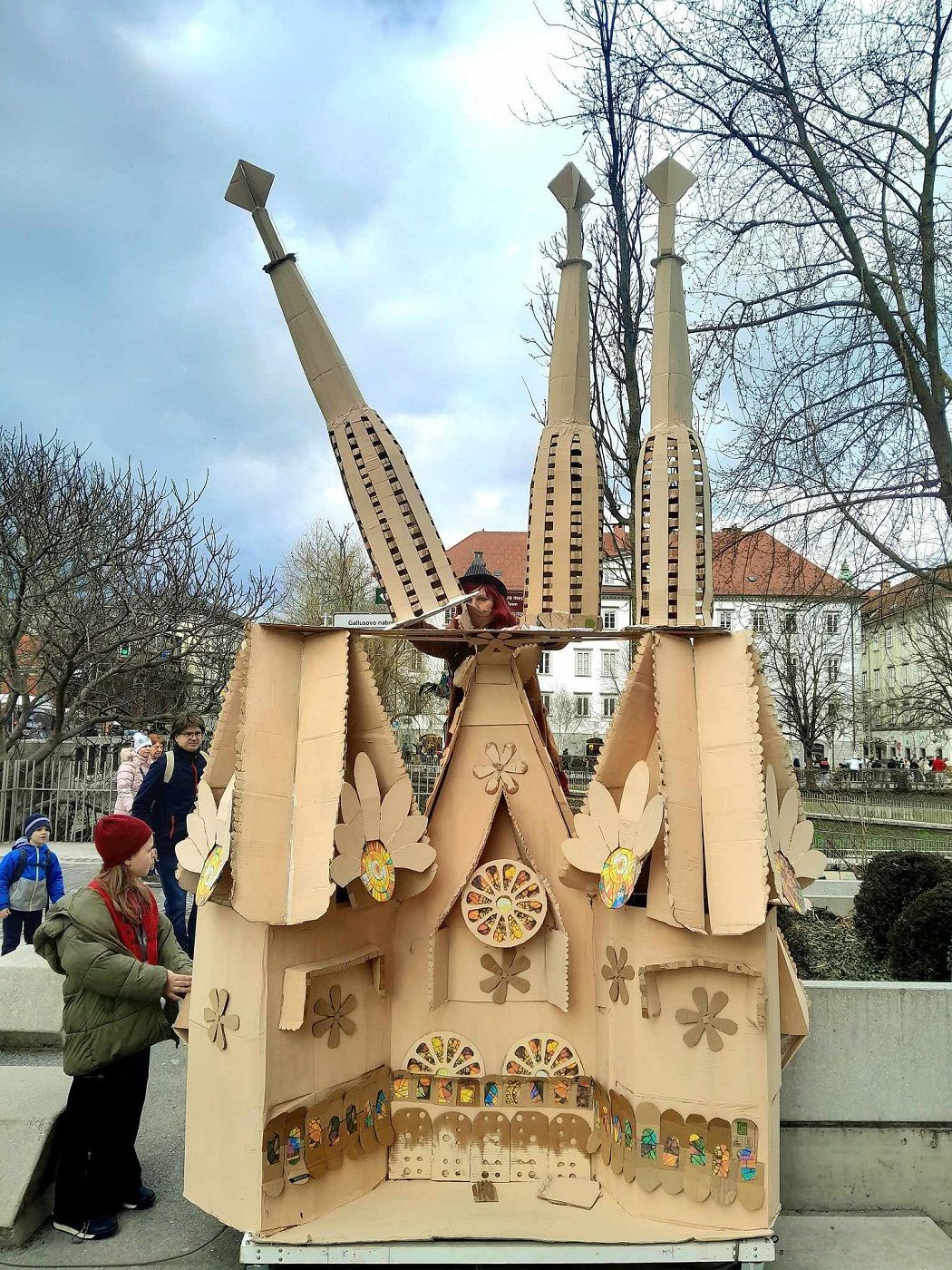 V daljavi se bohoti zanimiva cerkev – Gaudijeva Sagrada familia. Vsi si želijo, da bi imeli malo več časa. Škoda, da si ne morejo ogledati notranjosti. Sraki pa samo priganjata, kot prava turistična vodiča. Avtobus jih že čaka. Po čem bo zadišalo sedaj? (Učenci se v koloni prestavijo do malega Eifflovega stolpa.)