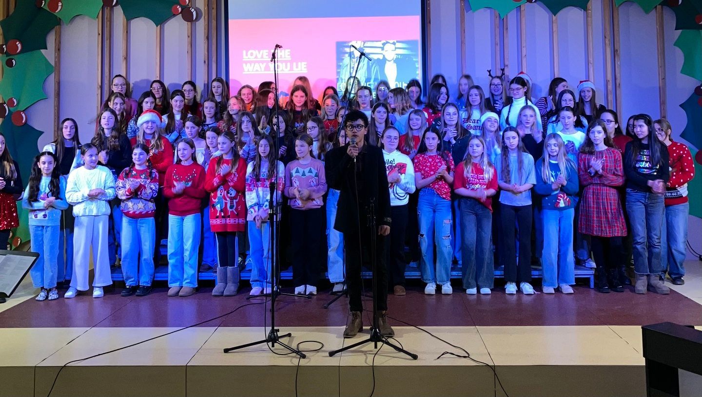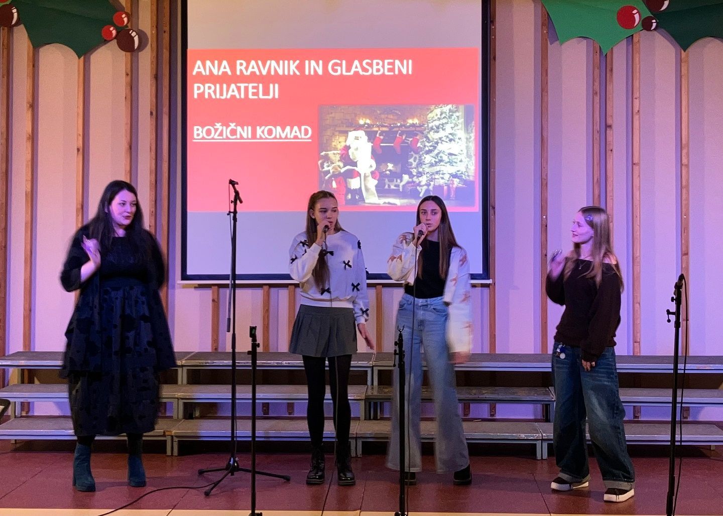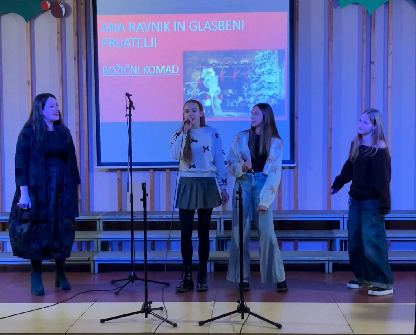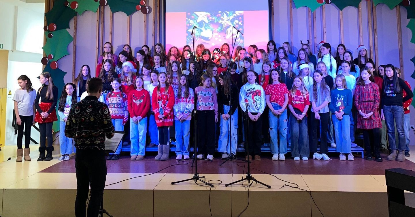 Dragi prijatelji, sošolci, učitelji, mamice, očiji, babice, dedki, tete in strici ter sestrične in bratranci! Ker že vse diši po decembru, bi vam radi nekaj podarili. Nekaj, kar smo naredili čisto sami. Saj veste, mi prisegamo na skupnost in sodelovanje, hkrati pa ne maramo ravno zgodb v slogu Black Friday, pa visoko letečih gesel in fraz. Zato vam podarjamo en čisto pristen Božični komad. Glasbo in besedilo je napisala naša Ana Ravnik. Prav ponosni smo, da smo lahko del njene družbe. Igrala je tudi klavir. Peti ji je pomagala Sofia Gaser, ki je ravno tako neprekosljiva glasbenica. Pri vokalih je pomagala tudi Vida. Na basu se je izkazala Sara Furlan (Božičkovo kapo dol za samostojno pogruntano bas linijo). Meri se je delala, da zna igrati kitaro. Požrtvovalni snemalki sta bili Neža Pirnar in Lina Pavič, polni izvirnih zamisli in fizično neutrudljivi. A celotna zgodba bi bila popolnoma neučinkovita, če v naši družbi ne bi bilo edinega predstavnika moškega spola Naia Merharja. Naš NAIjači Nai, tako mu ljubkovalno rečemo, ker vemo, da je virtuoz na kompu in vsemu, kar ima tam naloženega in česar navadni smrtniki ne razumemo. Ne bomo vam razlagali v kakšnih razmerah je nastal video, ki vam ga podarjamo. Žal si nismo mogli privoščiti fancy studia in opreme, tudi kamer ne, smo bili pa bogato opremljeni z ustvarjalnostjo, voljo, pogumom, kančkom drznosti in predvsem z vero v skupni cilj. Trdo smo delali, »špricali« sobotna domača opravila, jedli pizzo, ustvarjali in se pri tem neizmerno zabavali. Naša božična želja je, da kanček tega vzdušja skozi ta video prenesemo tudi na vas. Poslušajte nas, strokovnjaki pravijo, da je Božični komad »catchy«. Vaši: Ana, Sofia, Sara, Lina, Neža, Nai Mentorici: Vida Vincek & Marija Vincek